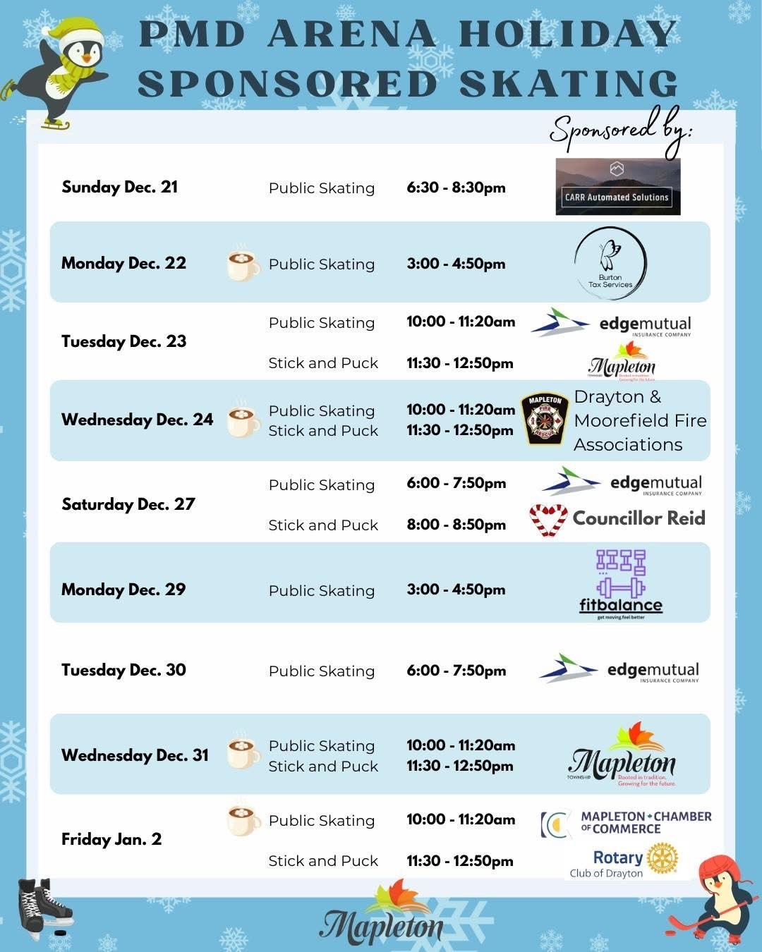 Our donations this year included our Adopt-a-Family program where we were able to support three local families in having a merrier Christmas, three local food banks that are important foundations for their respective communities, and two public schools' snack programs that keep the kids in our community fed and ready to learn. In addition, we also sponsored a few public skate times -- check out the schedule below.